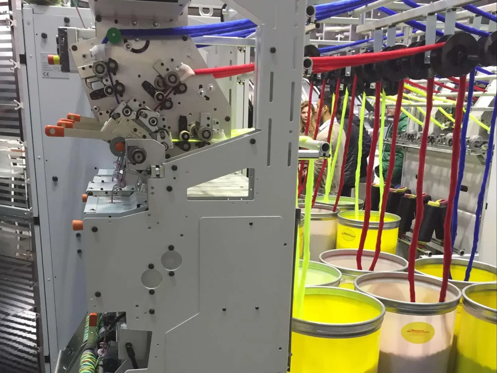 Supports up to five different color tops fed simultaneously, controlled by programmable logic for arbitrary sequence and length changes. This capability enables highly customizable and complex multicolor designs including stripes, gradients, jumps, and other fancy effects. The absence of a base color requirement offers greater creative freedom for diverse product offerings.